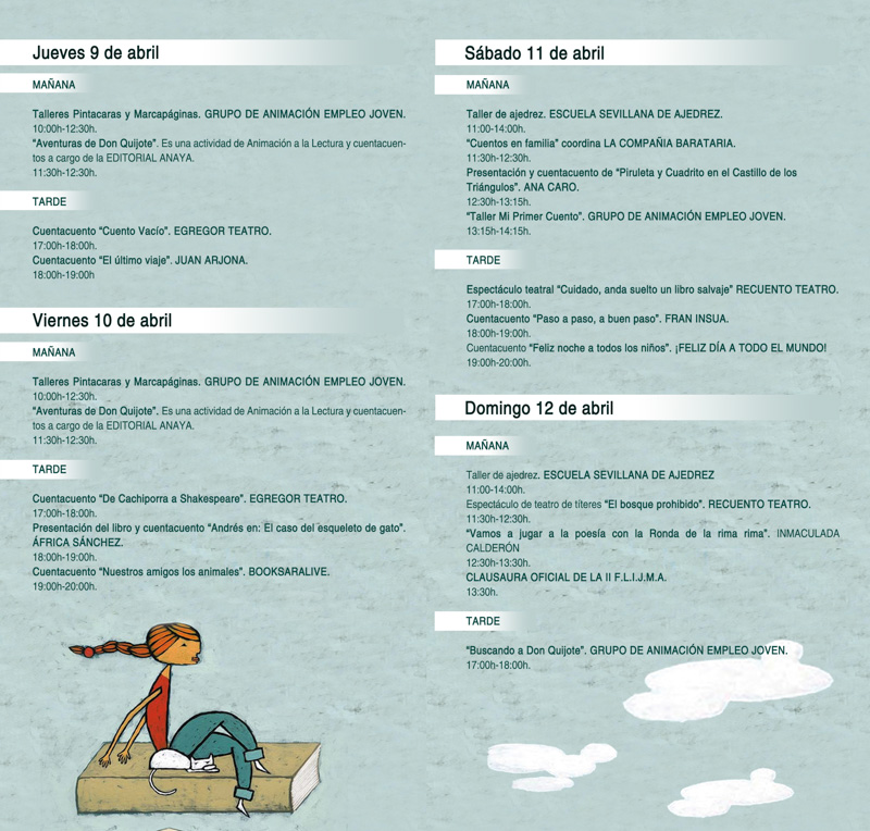 El Ayuntamiento de Mairena del Aljarafe, a través del Área de Cultura y del Instituto Municipal de Dinamización Ciudadana (IMDC), y con la colaboración de las Bibliotecas Municipales José Saramago y Rafael Alberti, organiza la II Feria del Libro Infantil y Juvenil con diversas actividades que se desarrollarán los días 9, 10, 11 y 12 de abril en el parque El Jardinillo ubicado entre la avenida de la Sabiduría y la calle Aristóteles.