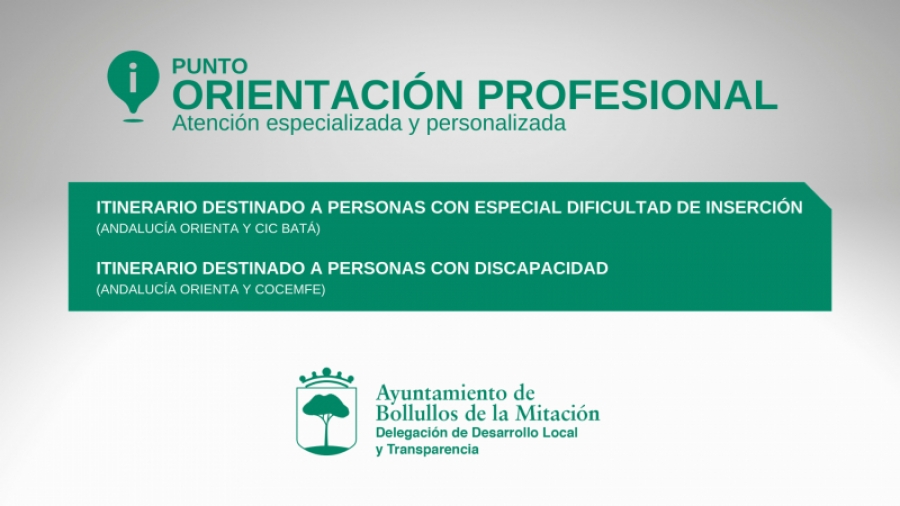 El primer itinerario, está destinado a prestar servicio de Orientación Laboral de manera directa e individualizada, a las personas desempleadas que se encuentren con especiales dificultades de inserción de su municipio.