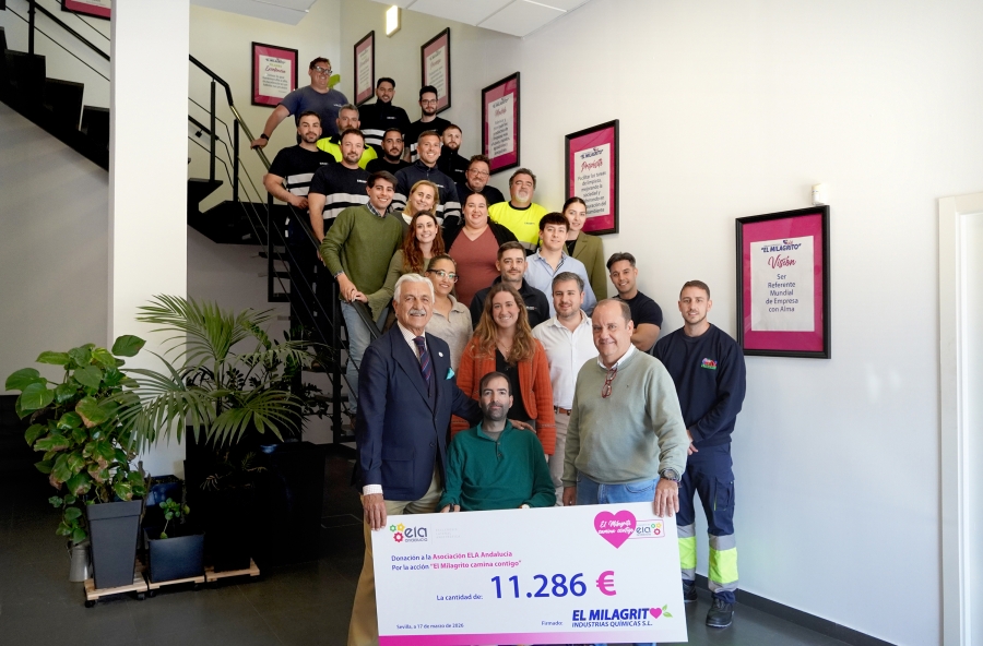 El Milagrito Industrias Químicas ha logrado recaudar un total de 11.286 euros gracias a su campaña solidaria “El Milagrito camina contigo”, una iniciativa desarrollada a nivel nacional durante todo el mes de febrero con el objetivo de apoyar a las personas afectadas por ELA (Esclerosis Lateral Amiotrófica), que se ha canalizado a través de la asociación andaluza en una acción apadrinada por Pepe Gastalver, jugador de rugby y empresario cuando se le diagnosticó la enfermedad hace ocho años y todo un ejemplo de resiliencia y de superación.