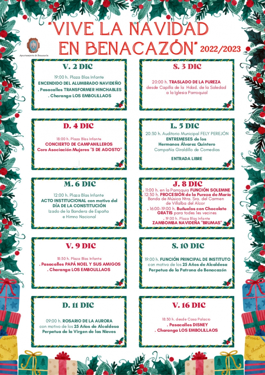 El Ayuntamiento de Benacazón presenta la Programación de Actividades "VIVE LA NAVIDAD EN BENACAZÓN" 2023/2023, que se desarrollarán desde el Viernes 2 de Diciembre de 2022 con el ENCENDIDO DEL ALUMBRADO hasta el próximo 05 de Enero de 2022, día de la Gran Cabalgata de Reyes Magos. La CORONACIÓN DE SUS MAJESTADES LOS REYES MAGOS DE ORIENTE, LA ESTRELLA DE GUÍA Y REINA MAYOR el Jueves 22 de Diciembre a partir de las 17:00 horas en la Plaza Blas Infante.