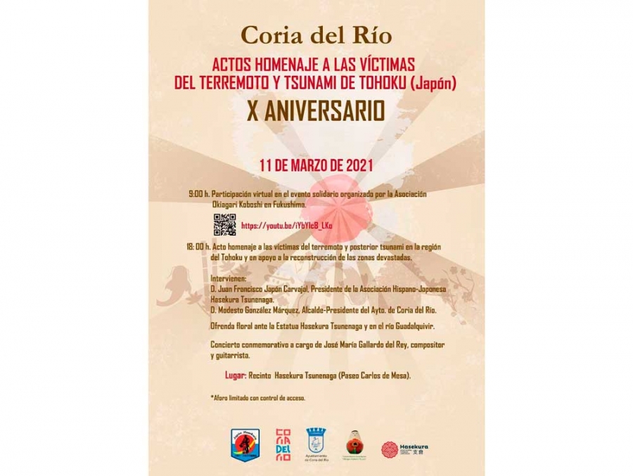 Desde entonces, la relación histórica que une a Coria del Río y a Japón ha hecho que en la localidad sevillana se realicen actos en homenaje a todas a esas personas que perdieron la vida. Este año, y debido a la situación de pandemia que vivimos, los actos será adaptados a esta conyuntura, para poder seguir conmemorando el décimo aniversario de esta tragedia. Por ello, Coria del Río ha sido invitada a participar de forma virtual en el evento solidario virtual que organizará la Asociación Okiagari Koboshi en Fukushima el próximo jueves 11 de marzo a las 9:00h, y donde estará presente el Alcalde Modesto González.