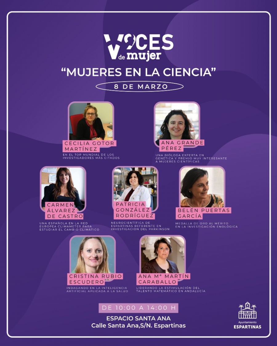 Participarán Cecilia Gotor Martínez, química en el top mundial de los investigadores más citados; Ana Grande Pérez, una bióloga experta en genética y premio "Muy Interesante a Mujeres Científicas"; Carmen Álvarez de Castro, doctora en climatología, forma parte de la red europea ClimaMeter para estudiar el cambio climático; Patricia González Rodríguez, neurocientífica y fisióloga referente en investigaciones del Parkinson; Belén Puertas García, Medalla de oro al mérito en la investigación enológica; Cristina Rubio Escudero, doctora en Ingeniería Informática y profesora e investigadora en la Escuela Técnica Superior de Ingeniería Informática de la Universidad de Sevilla; y Ana Martín Caraballo, licenciada en Matemáticas, Coordina en Andalucía el proyecto de Estimulación del Talento Matemático (ESTALMAT). La entrada es gratuita hasta completar aforo.