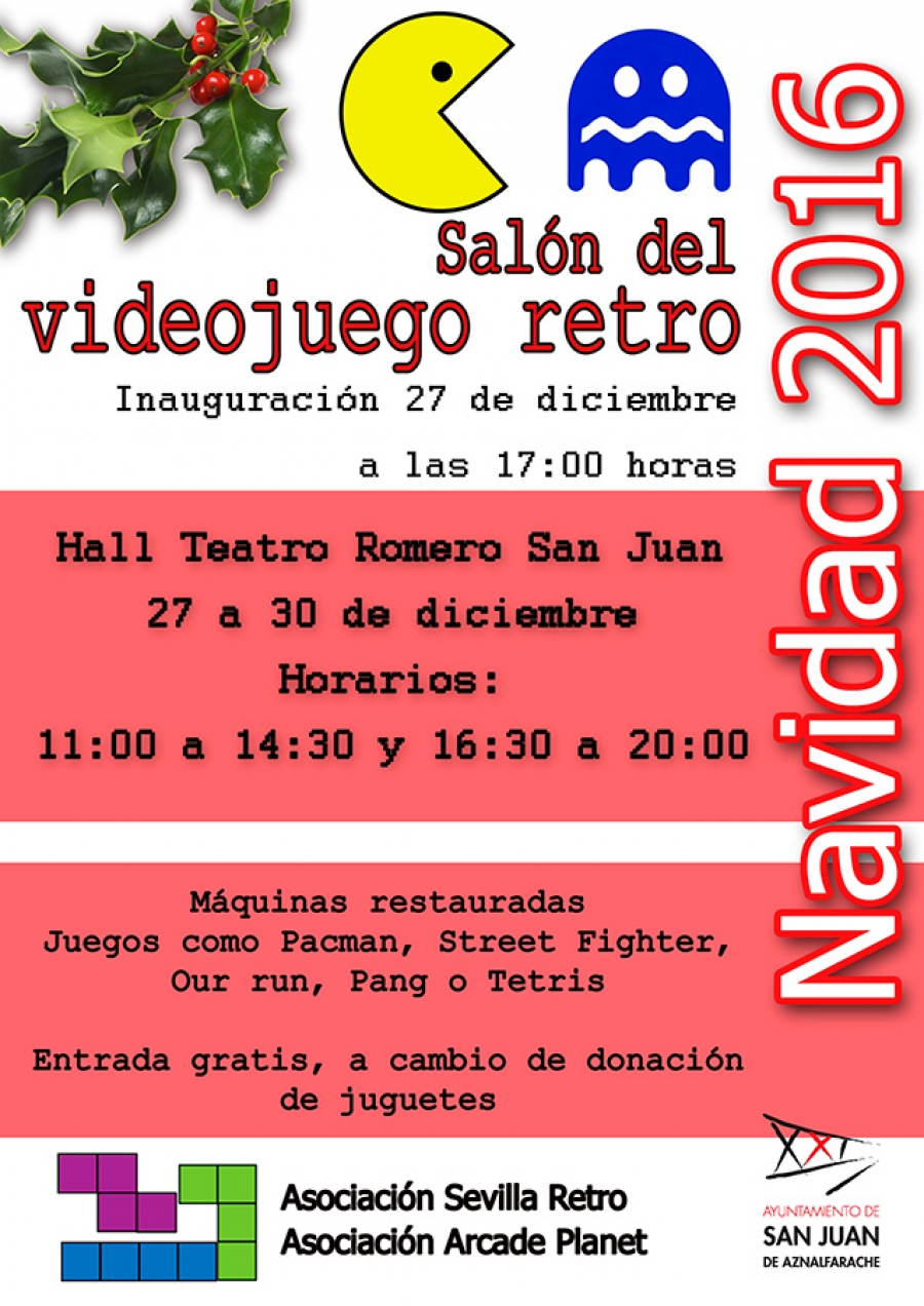 ¿Y todo esto por qué? Debido a que a las 17:00 horas del 27 de diciembre se inaugura el I Salón del Videojuego Retro de San Juan de Aznalfarache que estará abierto para poder seguir haciendo flashbacks hasta el 30 de diciembre. En este I Salón, los participantes tendrán la oportunidad de disfrutar con los videojuegos que hicieron furor en los 80 y en los 90 en las máquinas originales que Arcade Planet y Sevilla Retro han restaurado.