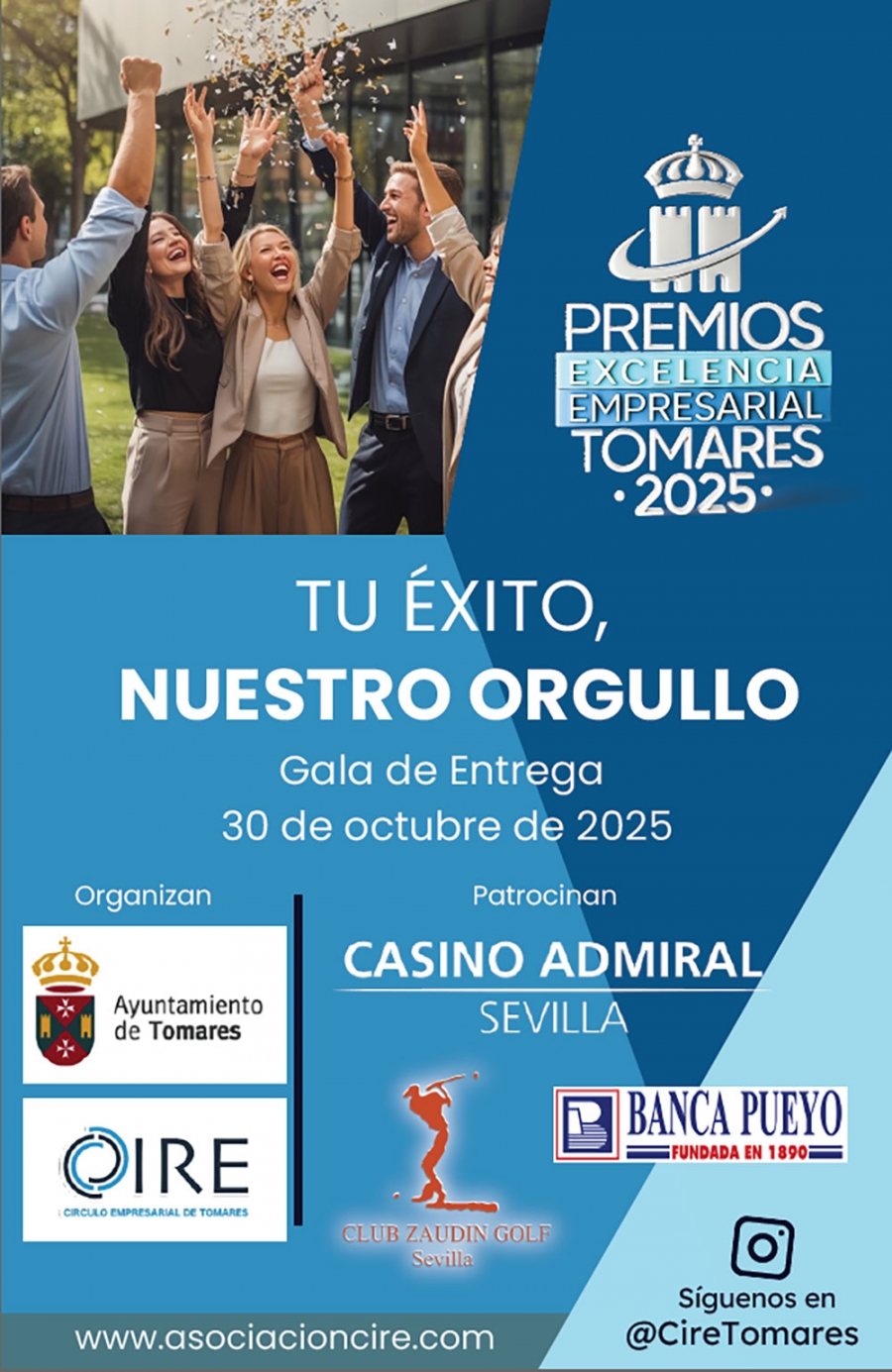 El alcalde de Tomares, José María Soriano, y la presidenta del Círculo de Empresarios de Tomares (CIRE), Maria Ángeles Ponferrada, acompañados por el vicepresidente de la Confederación de Empresarios de Sevilla (CES), Juan Pedro Calvente, entregarán hoy, 30 de octubre, los V Premios a la Excelencia Empresarial “Ciudad de Tomares” 2025. Será a las 20:00 horas, en Casino Admiral Sevilla (Avda. de la Arboleda, s/n. Tomares)
