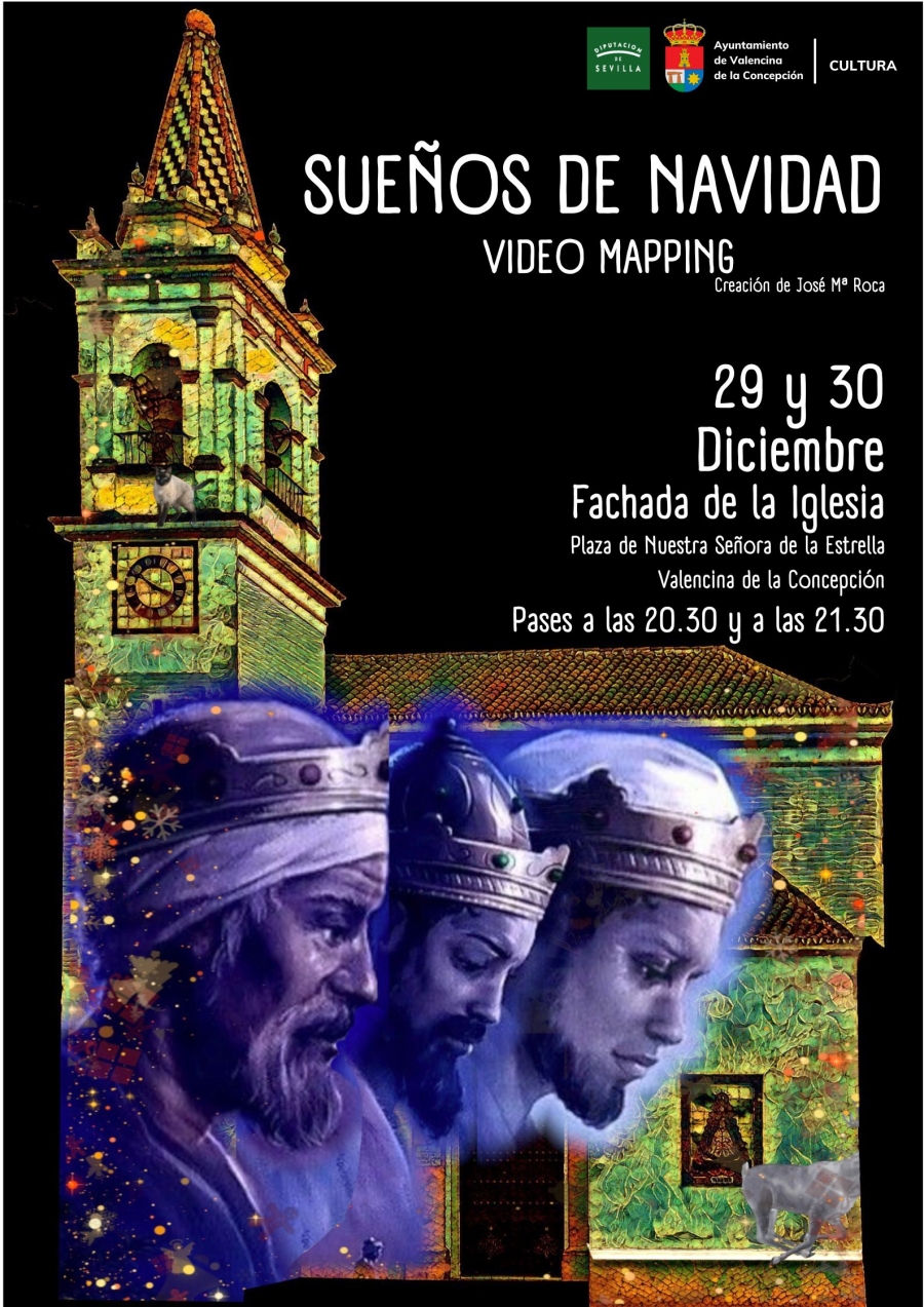 Concretamente, el "Video Mapping" se proyectará sobre la fachada de la Iglesia de Nuestra Señora de la Estrella de Valencina de la Concepción, que servirá como lienzo de la creación "Sueños de Navidad", una producción original del artista José María Roca, director de teatro, productor, fundador de la Sala Imperdible y vecino de Valencina de la Concepción.