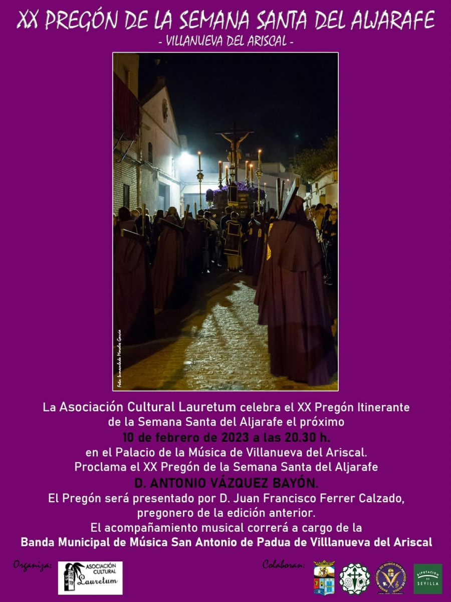 El XX Pregón Itinerante de la Semana Santa del Aljarafe, que organiza la Asociación Cultural Lauretum, ya tiene fecha. Se celebrará el 10 de febrero de 2023 a las 20:30 horas en el Palacio de la Música de Villanueva del Ariscal. Este año cuenta como padrinos con el Ayuntamiento de dicha localidad y la Hermandad de Vera Cruz.