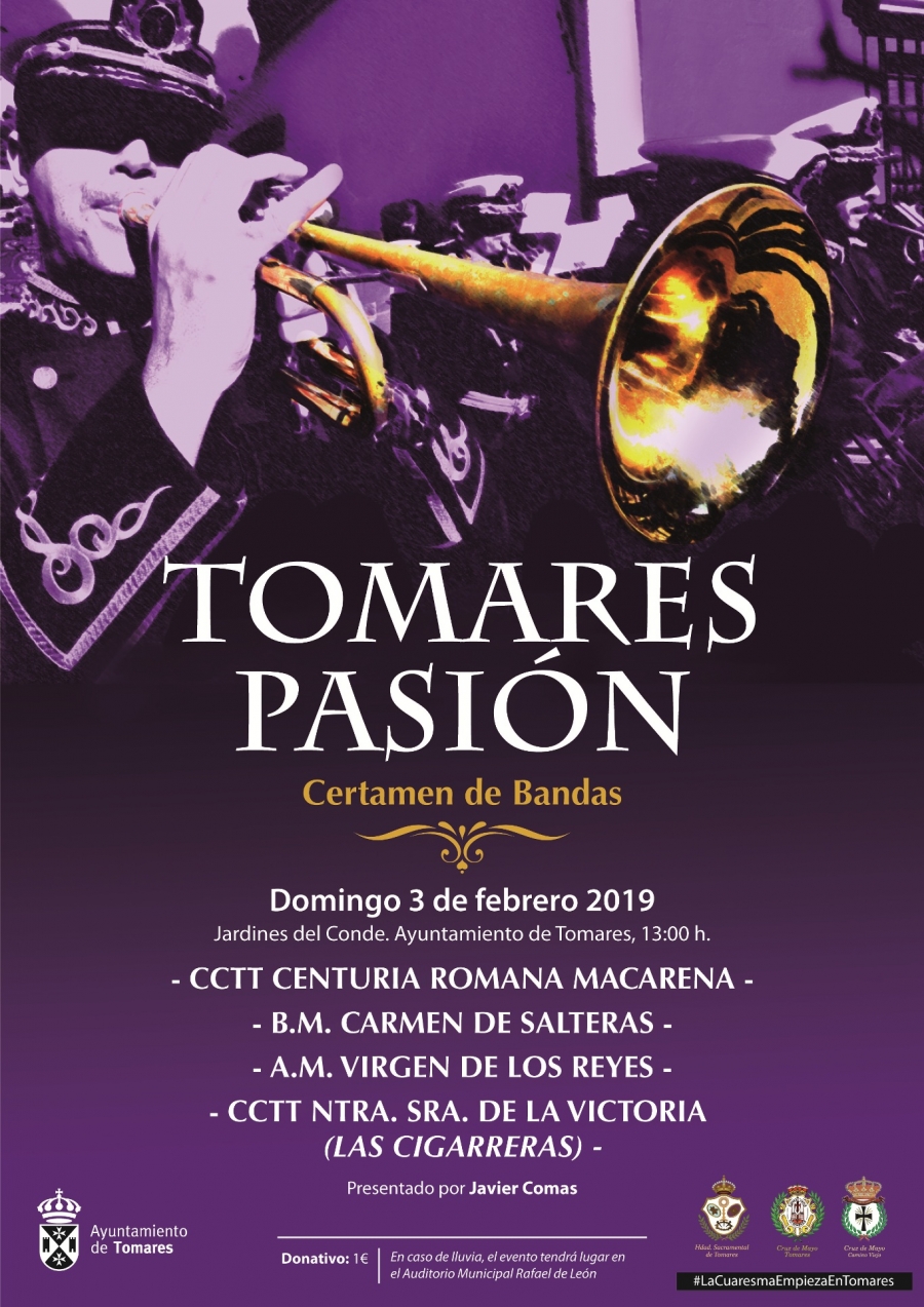 Los amantes de la música cofrade no pueden perderse el singular certamen de bandas de cornetas y tambores “Tomares Pasión”, que tendrá lugar el próximo domingo, 3 de febrero, en los Jardines del Conde de Tomares. Como magnífico anticipo de las bellas composiciones musicales que podrán escucharse en la Semana Santa sevillana acompañando a los titulares de algunas de las Hermandades con más devoción y tradición, cuatro de las agrupaciones musicales cofrades más reconocidas se reúnen en Tomares para ofrecer un certamen benéfico: la CCTT Centuria Romana Macarena, popularmente reconocidos como los “Armaos”; la Banda del Carmen de Salteras, la A.M. Virgen de los Reyes y la CCTT de Ntra. Sra. de la Victoria, conocida como “Las Cigarreras”.