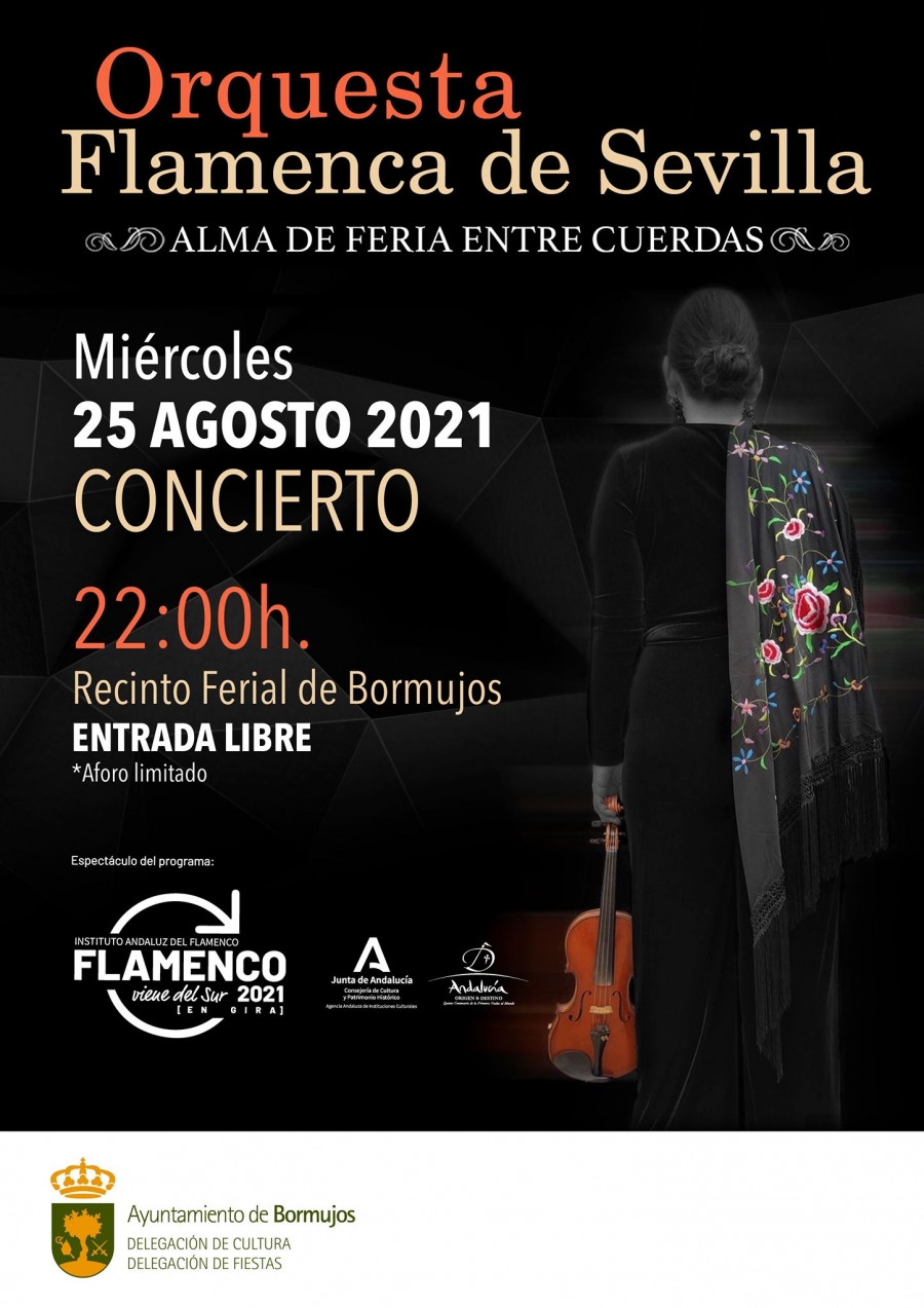 La primera cita será con el flamenco, a partir de las 22:00h. en el recinto ferial de Bormujos, con el espectáculo "Alma de Feria entre cuerdas" de la Orquesta Flamenca de Sevilla, dentro del Programa "Flamenco viene del Sur 2021" promovido por A. Andaluza de Instituciones Culturales de la Consejería de Cultura y el Instituto Andaluz de Flamenco.