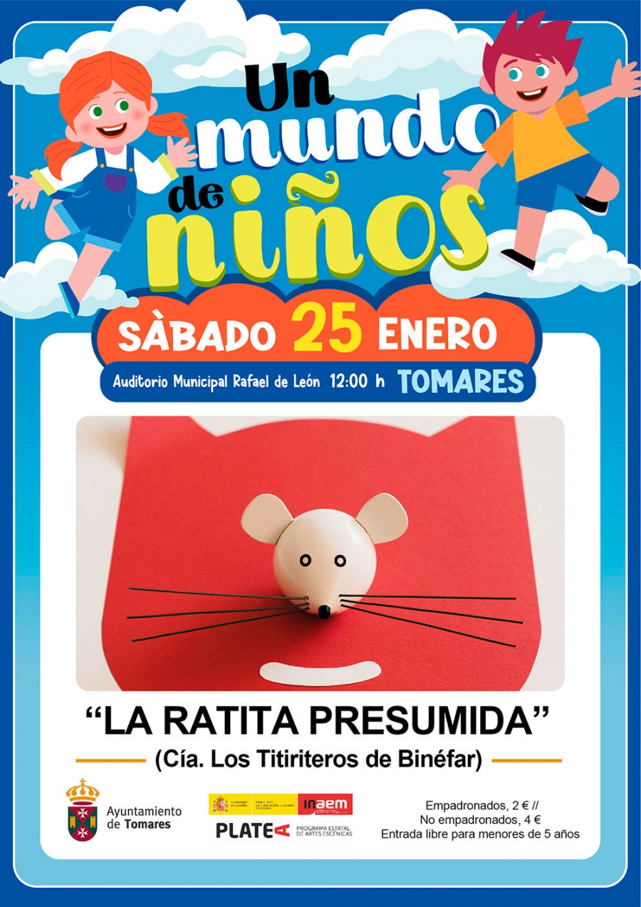 El Ayuntamiento de Tomares, que inauguró el pasado sábado, 18 de enero, la nueva temporada cultural infantil de 2025 con la magia del clásico inmortal del autor francés Antoine de Saint-Exupéry, “El Nuevo Principito”, de BricAbrac Teatro, ofrecerá este sábado, 25 de enero, el teatro de marionetas “La Ratita Presumida” inspirado en el cuento clásico, que será puesta en escena por la compañía Titiriteros de Binéfar, con más de 40 años de experiencia, distinguida en 2009 con el Premio Nacional de Teatro para la Infancia y la Juventud, y la Medalla al Mérito Profesional del Gobierno de Aragón en 2018.