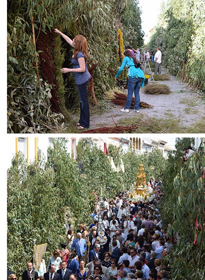 Con la colaboración de los paisanos y de hermandades de la localidad se crean arcos de flores y altares presididos por figuras de seises, ángeles o esculturas marianas, en la mañana del domingo.