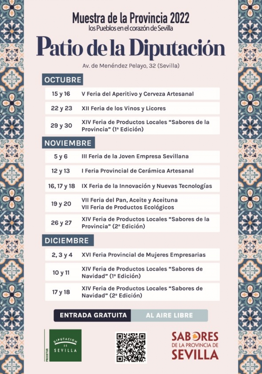 El Patio de la Diputación de Sevilla acogerá hasta diciembre una nueva edición de la Muestra de la Provincia de Sevilla, organizada por Prodetur tras el éxito de la edición anterior a la que asistieron casi 30.000 visitantes. Como novedad se recuperará el escenario como eje fundamental de dinamización de las ferias, en torno al cual se desarrollarán las diferentes actividades complementarias a la temática del evento. Otra novedad consistirá en la climatización interior de todos los stands mediante máquina de aire acondicionado individual con sistema frio-calor, y funciones frio, calor, ventilación y deshumidificación.