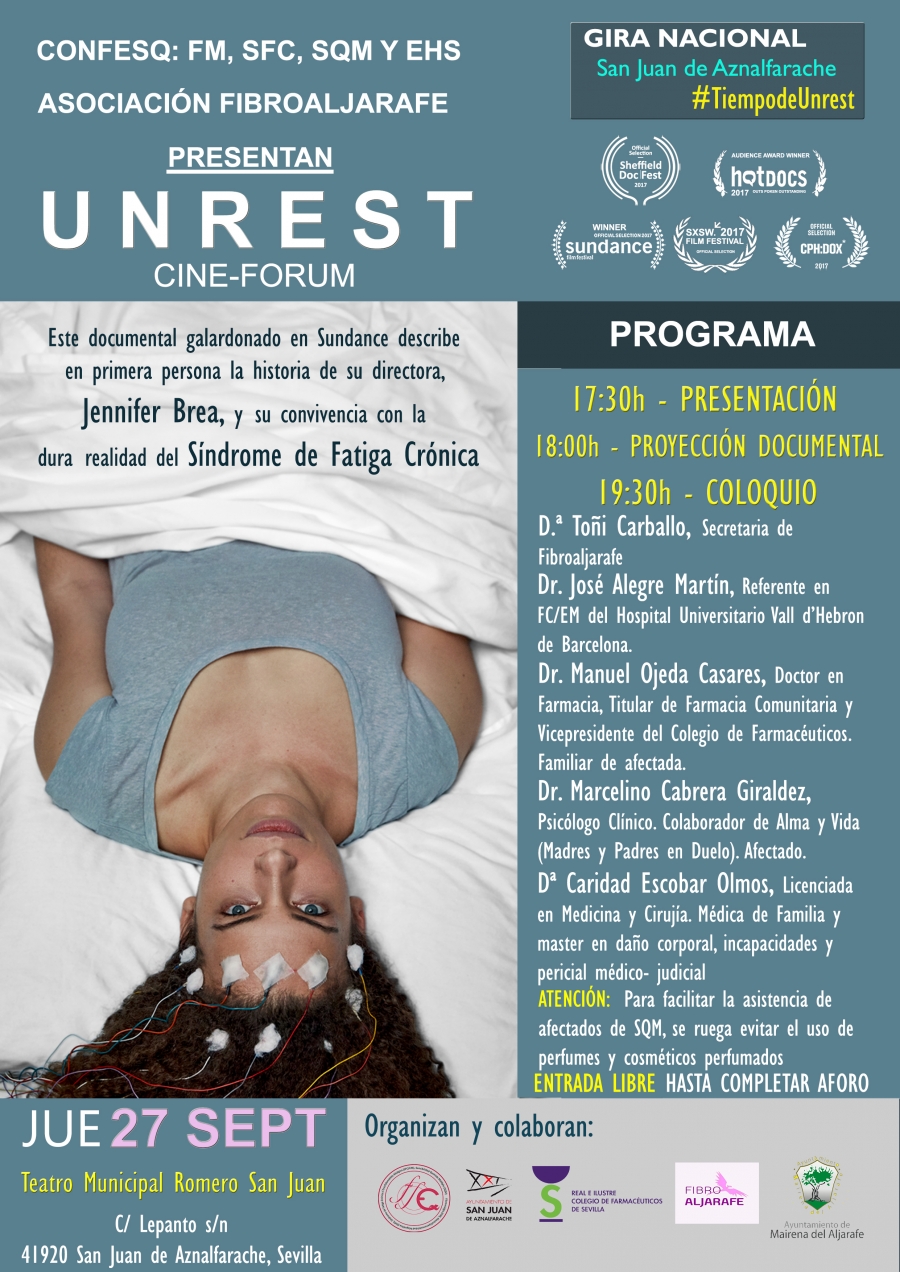 La Asociación Fibroaljarafe organiza el jueves 27 de septiembre una Jornada de información y divulgación sobre el Síndrome de Fatiga Crónica (SFC/EM). El acto, que se celebrará en el Teatro Municipal Romero San Juan (San Juan de Aznalfarache), incluirá la proyección de la película documental «UNREST», dentro de la gira organizada por la Confederación Nacional de Síndromes de Sensibilidad Central. La jornada se cerrará con un coloquio en el que participarán algunos de los principales especialistas en esta enfermedad.