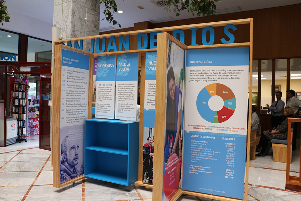 Se trata de un novedoso concepto expositivo, diseñado por la arquitecta Marta Barranco que permite a los visitantes interactuar con el espacio a través de paneles giratorios con imágenes y mensajes alusivos a la actividad solidaria desarrollada por la Orden de San Juan de Dios a través de sus centros.