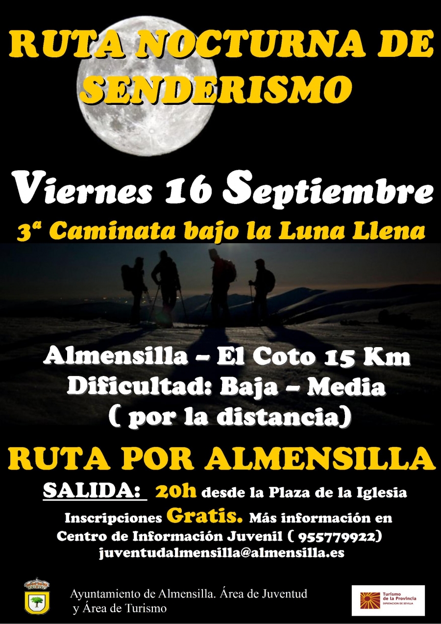 Para finalizar las actividades veraniegas del Ayuntamiento de Almensilla las Concejalías de Juventud y Turismo organizan para el viernes 16 una Ruta Nocturna de Senderismo (3ª Caminata bajo la luna llena).