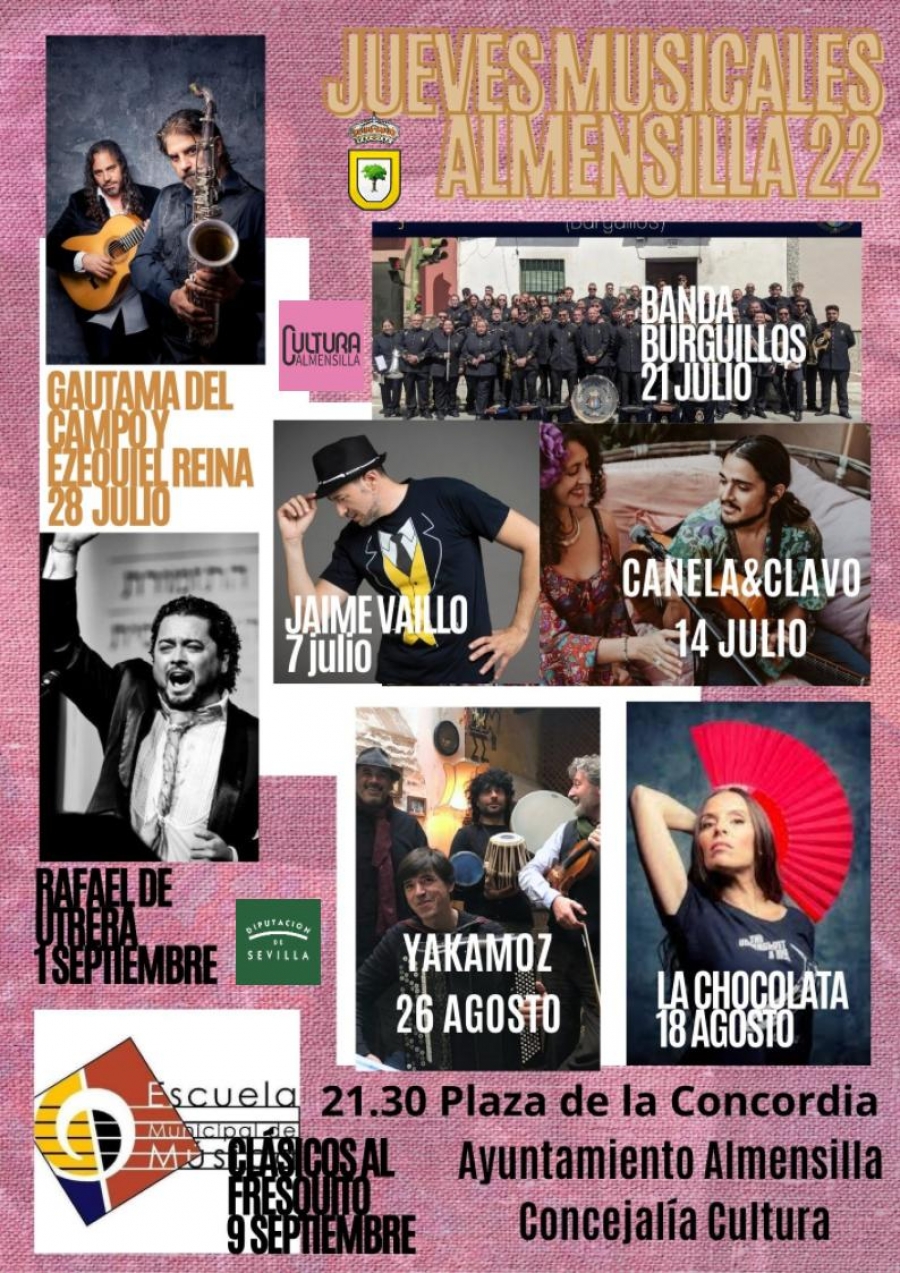 Se hará una pausa la primera quincena de agosto y volvemos con la cantante y bailaora polifacética "Chocolata" el 18, y el 26 actuará el grupo étnico "Yakamoz". Septiembre empieza con el flamenco Rafael de Utrera el día 1, y cierra la programación, esta vez en viernes, la Escuela Municipal de Música EMMA con sus ya habituales "Clásicos al fresquito".