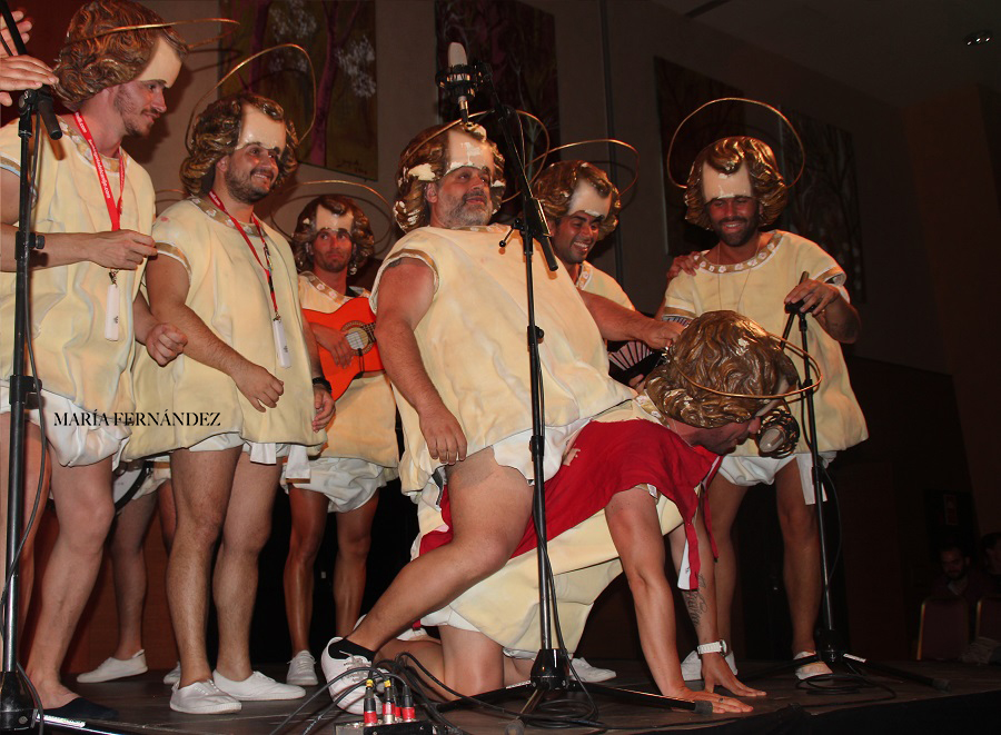 La chirigota del Canijo de Carmona, “El niño Jesús que tenía tu mare en la mesita de noche”, fue la encargada de inaugurar esta tercera edición. El público los esperaba con ansia y no defraudaron. Con temas de este año y de otros anteriores volvieron a confirmar por qué siguen estando en lo más alto del Carnaval. Interactuaron en muchas ocasiones con el público, haciéndoles sentir parte del repertorio, algo habitual en el Canijo y su chirigota.