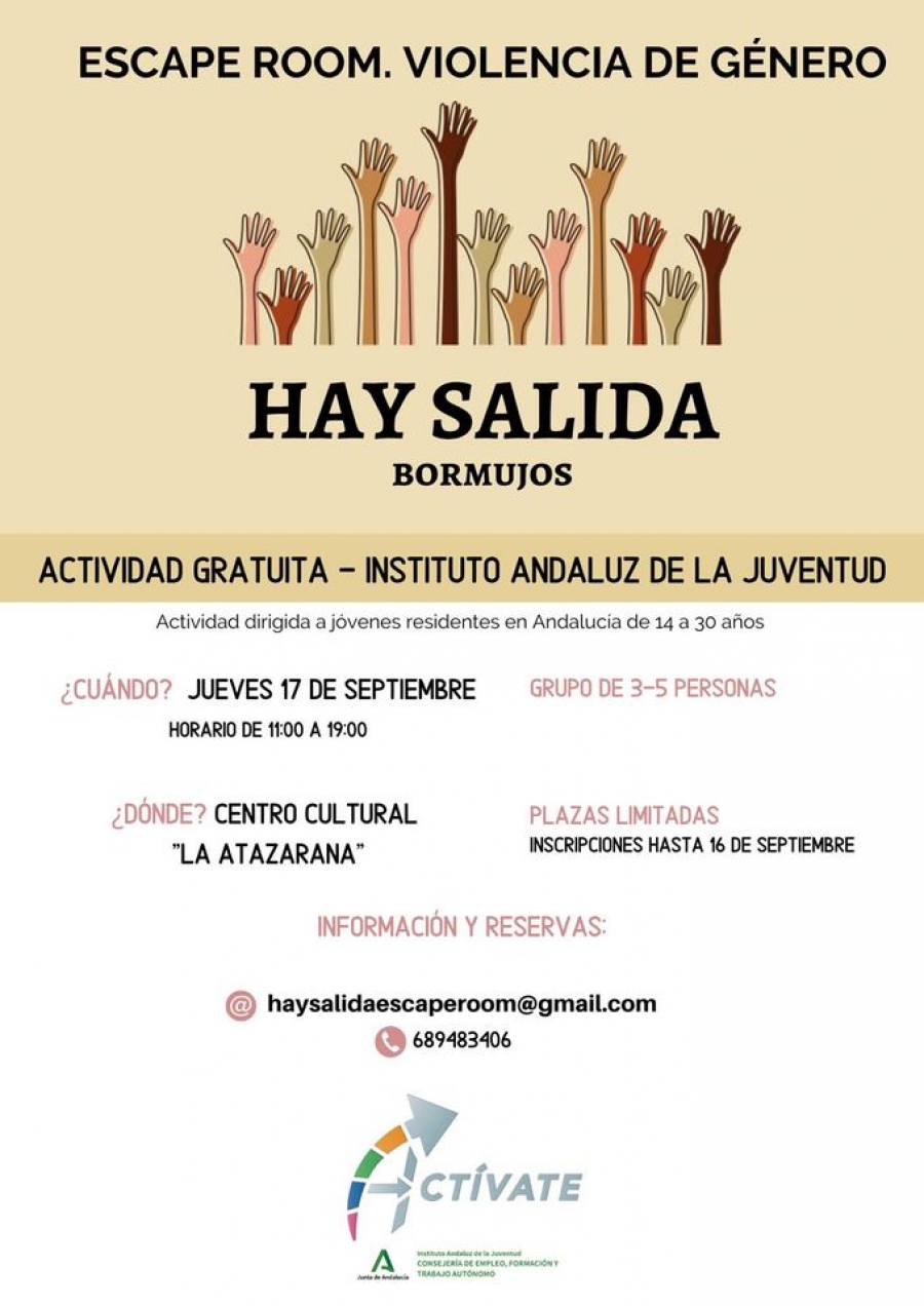 Es la experiencia que vivirán las/los participantes en el juego que hoy jueves pone en marcha el Instituto Andaluz de la Juventud, en colaboración con el Ayuntamiento de Bormujos, en la localidad. Se trata del "Escape room. Hay salida" mediante el que se trata de concienciar a los jóvenes, de entre 14 y 30 años, sobre la violencia de género, simulando en la actividad una historia en la que deberán ponerse en la piel de las mujeres que viven situaciones de desigualdad.