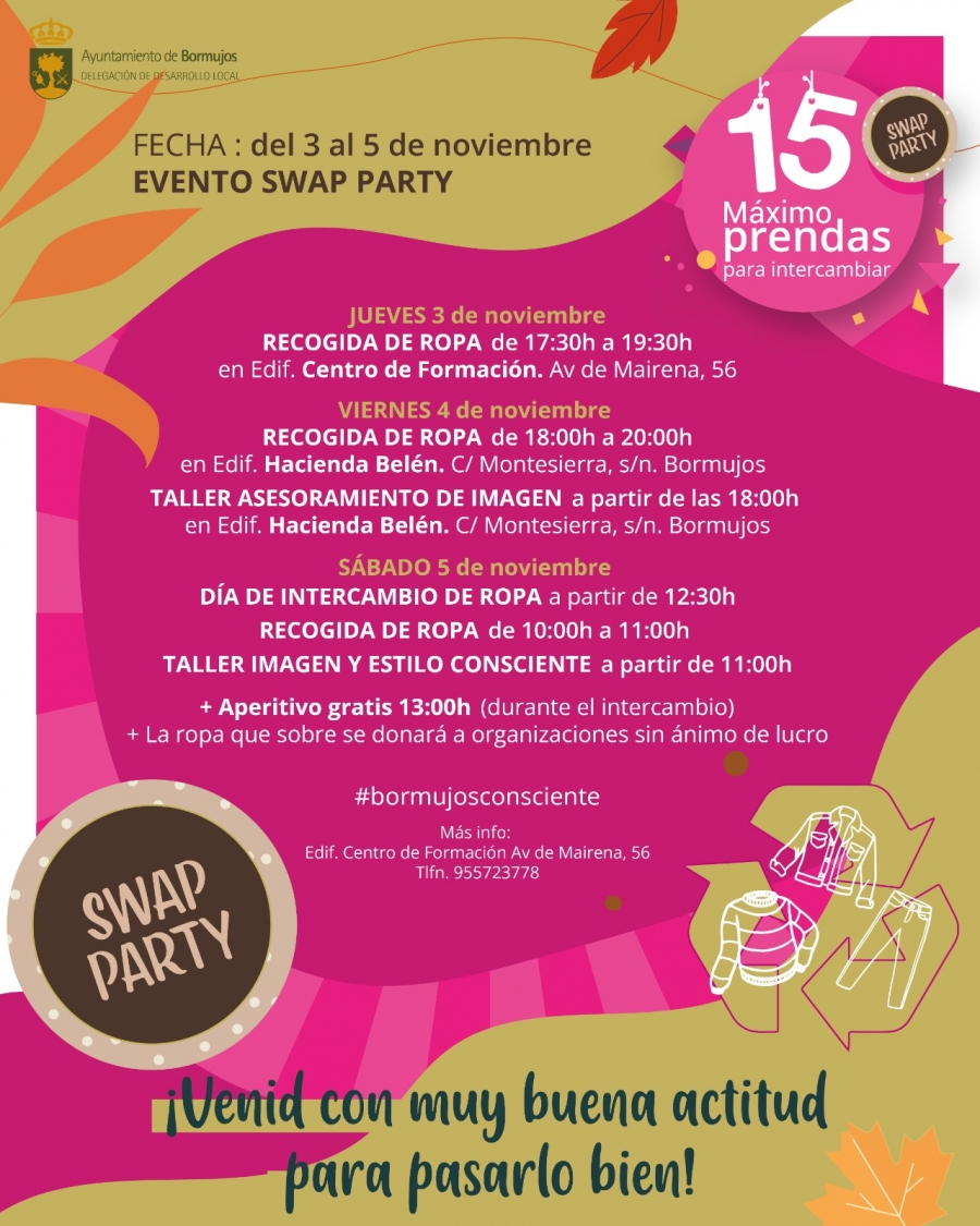 La dinámica consiste en que las personas que acudan a la Swap Party deben dejar primero en los puntos de recogida prendas de ropa, accesorios, bolsos etc. que serán valoradas en swappies, la moneda oficial de la fiesta. El jueves 3 de noviembre en horario de 17:30 a 19:30 h. se inicia la recogida de ropa en el Centro de Formación de la localidad (Avenida de Mairena, 56). El viernes continúa la recogida, esta vez en la Hacienda Belén (C/ Montesierra, s/n) -donde se efectuará el intercambio de ropa- de 18:00 a 20:00 h. Además, desde las 18:00 h., Pilar Martín Navarro impartirá el taller "Asesoramiento de imagen" en el que los participantes recibirán consejos sobre su propio armario y estilo.