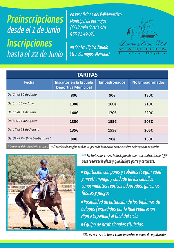 Las preinscripciones pueden hacerse desde el 1 de junio en las oficinas del Polideportivo Municipal de Bormujos y las inscripciones hasta el 22 de junio en el Centro Hípico Zaudín.