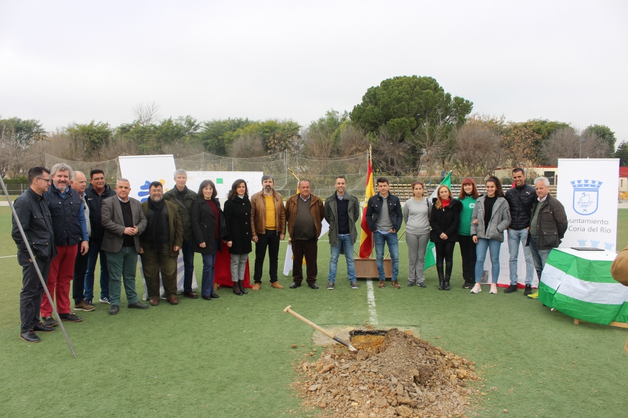 El alcalde de Coria del Río, Modesto González, y la Delegada de Deportes, María José Lora, han presidido hoy el acto de colocación de la primera piedra de las obras que se realizarán en el Polideportivo Alcdalde Fernando Suárez Villar. Al evento han acudido representantes políticos municipales de PSOE y de Coria Puede, además de deportistas locales y miembros las directivas de varios clubes.