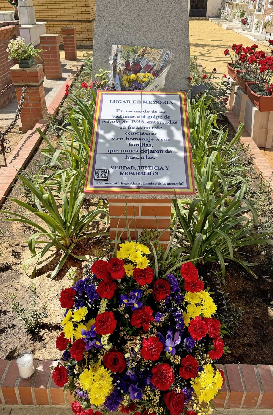 El pasado 19 de abril, Espartinas inauguró su Lugar de Memoria en el Cementerio Municipal de San Fernando, un monolito y un jardín erigidos para honrar a los cuerpos encontrados en las fosas comunes de este lugar.