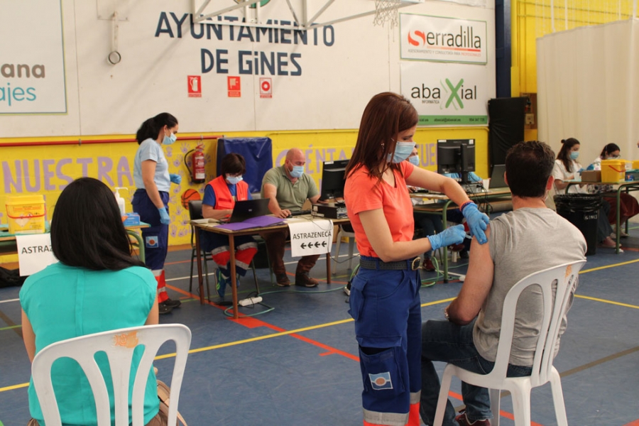 Los trabajadores esenciales vacunados en su día con AstraZeneca reciben desde este miércoles en el Pabellón Cubierto de Gines su segunda dosis, pudiendo elegir entre la vacuna de la misma marca o la de Pfizer.