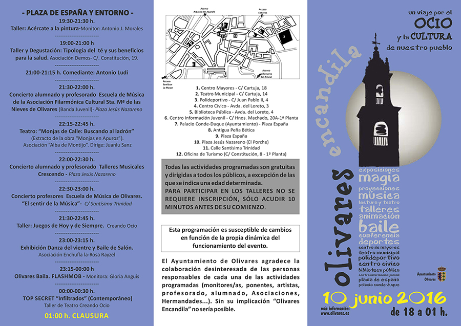 El comienzo tendrá lugar a las 18:00h, en el Patio del Ayuntamiento de Olivares, en el que se hará una breve presentación del programa para luego dar paso a cada uno de los espacios y actividades que van a ofrecerse a partir de las 19:00h; desde el Centro de Mayores, Teatro Municipal, Polideportivo, Centro Cívico, Biblioteca Pública, Centro de Información y Recursos para Jóvenes y Palacio del Conde-Duque (Ayuntamiento). A partir de las 21:00h hasta la 01:00h, toda nuestra programación se centrará en la Plaza de España, su entorno (C/. Santísima Trinidad y Plaza Jesús Nazareno) y el Patio del Ayuntamiento; charangas de nuestro municipio amenizarán las calles de Olivares desde las 20.45h.