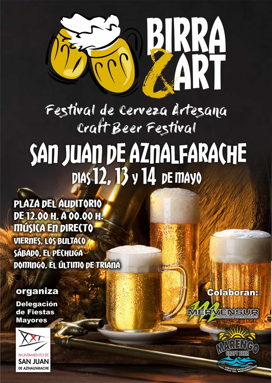 San Juan de Aznalfarache se prepara para acoger una amplia feria de cervezas artesanales de calidad elaboradas en Andalucía. El Festival de cerveza “Birra & Art” es una iniciativa de la delegación de Fiestas Mayores del Ayuntamiento que se celebrará del 12 al 14 de mayo en la plaza del Auditorio en horario de 12:00h a 00:00h.