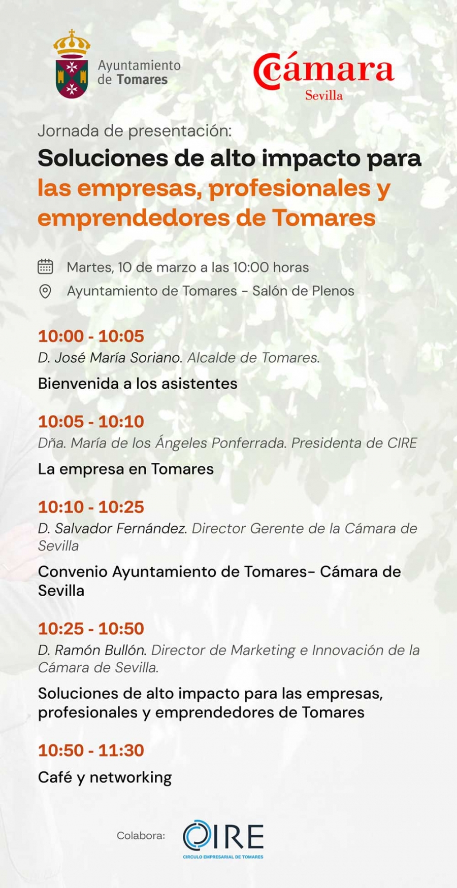 El Ayuntamiento de Tomares, en su apoyo al tejido empresarial del municipio, ha organizado junto con la Cámara de Comercio de Sevilla, y el Circulo Empresarial de Tomares (CIRE), este martes, 10 de marzo, la Jornada “Soluciones de alto impacto para las empresas, profesionales y emprendedores”, una interesante mesa redonda en las que se darán a conocer iniciativas, programas de apoyo y recursos diseñados para ayudar a pymes, autónomos y emprendedores en el crecimiento y consolidación de sus proyectos empresariales. Serán de 10 a 11:30 en el Salón de Plenos del Ayuntamiento y finalizarán con un Café y networking.