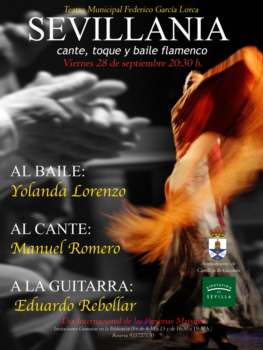 A partir de las 20:30 horas de hoy, viernes 28 de septiembre, las personas mayores de Guzmán podrán disfrutar del espectáculo flamenco ‘Sevillanía’, en el que bailará Yolanda Lorenzo acompañada de Manuel Romero al cante y de Eduardo Rebollar a la guitarra, en conmemoración del Día Internacional de las Personas Mayores.
